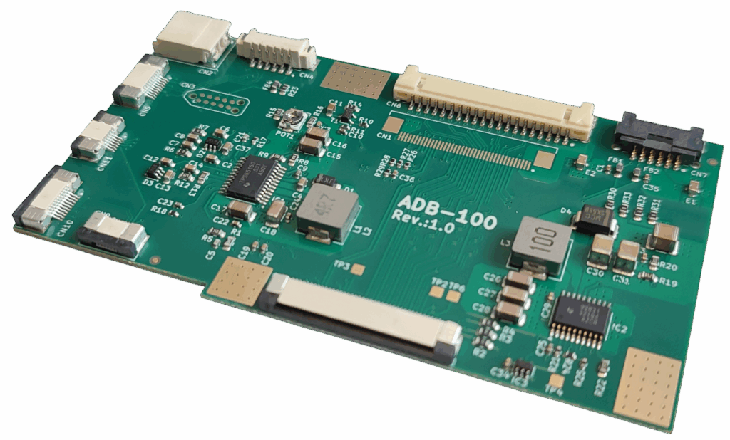 Die ADB-100 ist eine kompakte, einseitig bestückte Adapterplatine, die 7″- und 10.1″-LCD-TFT-Displays mit LVDS-Schnittstelle über eine einheitliche Board-to-Wire-Schnittstelle ansteuerbar macht. Sie erzeugt alle notwendigen LCD-Bias-Spannungen (VGL, VGH, VCOM) aus einer einzigen 3,3 V-Versorgung, integriert einen leistungsstarken LED-Treiber mit bis zu 480 mA und 40 V Ausgangsspannung sowie eine standardisierte I²C-Touch-Controller-Schnittstelle. Die Platine wird direkt auf der Rückseite des Displays montiert und reduziert so den Integrationsaufwand erheblich. Ab sofort sind die ersten Serienprodukte verfügbar: ein 7″-Display mit 1024 × 600 Pixeln und ein 10.1″-Modell mit 1280 × 800 Pixeln.