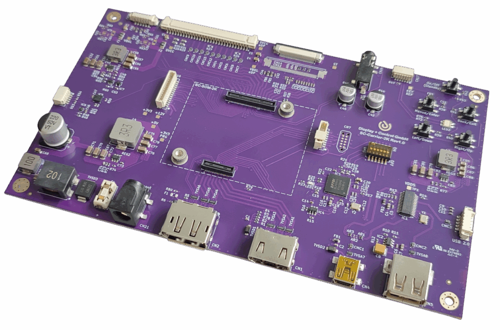 Das SC-Carrier-2K ergänzt das Modul als umfassende Entwicklungsplattform. Es bietet HDMI und DisplayPort Videoeingänge, einen integrierten USB-Programmierer für Firmware- und EDID-Programmierung sowie einen USB 2.0-Hub für Peripheriegeräte wie Touch-Controller. Die Plattform unterstützt ein- und zweikanalige LVDS-Displays (bis 1920×1200) mit VESA- und Open-LDI-Datenmapping sowie 2-/4-Lane-eDP-Displays (bis 2560×1000). Zu den weiteren Funktionen gehören ein OSD-Keypad (4+1 Tasten), duale Status-LEDs, ein 3,5-mm-Audiobuchse für Stereo-Ausgabe und integrierte Sensoren (3-Achsen-Gyro, Temperatur). Die Stromversorgung erfolgt über eine +12V-Quelle.